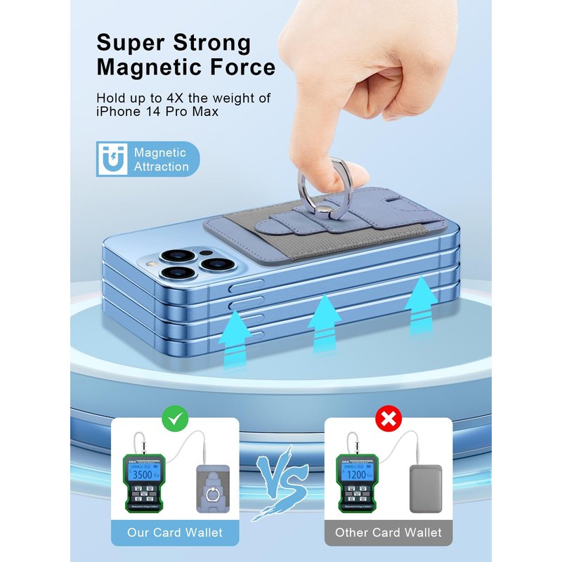 - 【Super Strong Magnetic Force】Our magsafe wallet features strong built-in magnets and the magnetic force is up to 3800Gs, 50% stronger than official magnetic card holder wallet allows it to effortlessly snap into place on the back of your iPhone, no worry about the cards and cash falling off. You can even stack it on top of a clear or silicone case with MagSafe to create a look that’s unique to you.