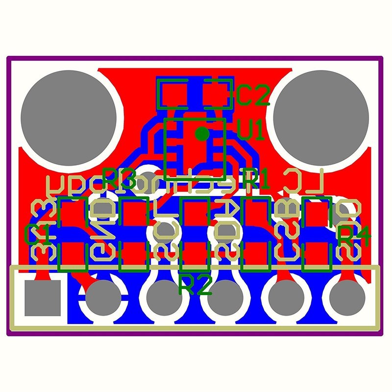 The board has selectable I2C address jumper (solder link GS2), I2C pull-up resistors, 7 pin header 2.54mm, and two mounting holes 3.5mm.