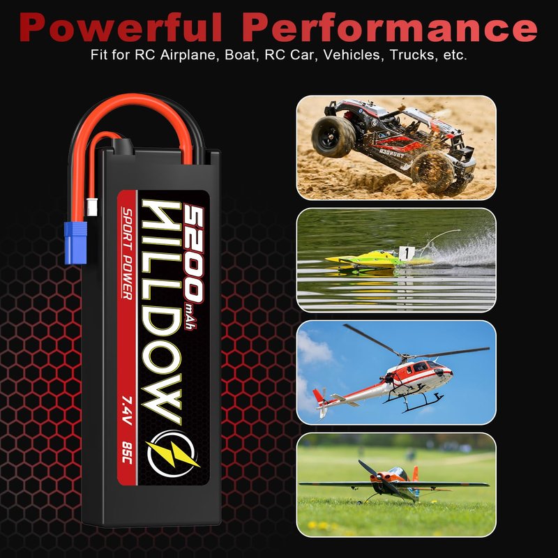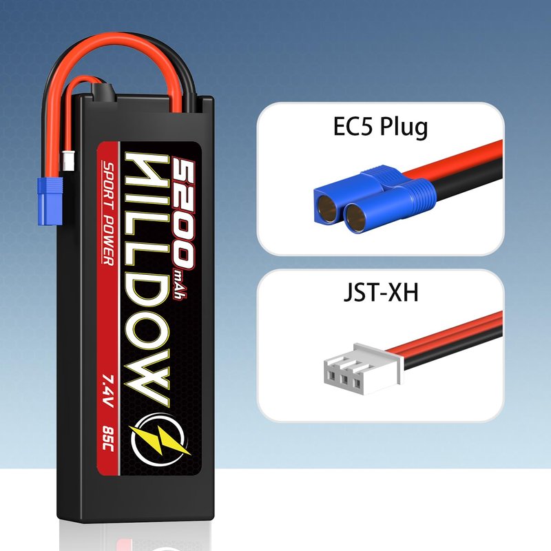 Hilldow 7.4V Lipo Battery 2S 85C 5200mAh Lipos Hard Case Rechargeable Batteries with EC5 Connector for1/8 1/10 RC Vehicles Car Slash RC Buggy Truggy RC Airplane Drone