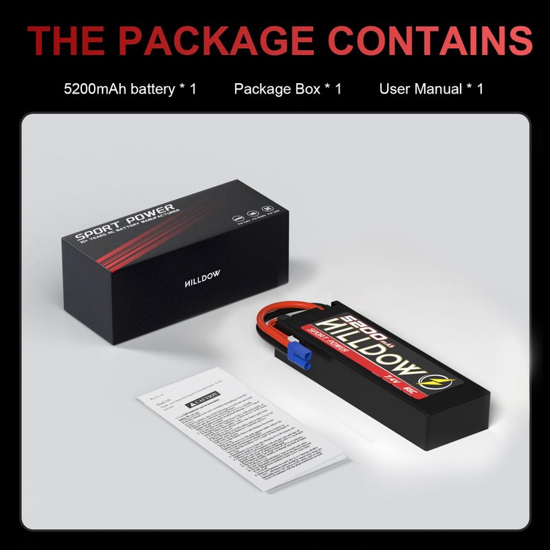- 【Dimension & Weight】- Hilldow 2s rc battery 5200mAh is : 138*47*25mm/5.43*1.85*0.98inch (L*W*H); Single battery weight: 310g/8.9oz.