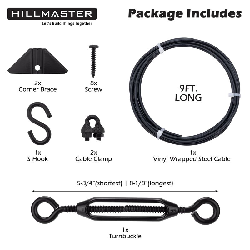 - 【Package Include】Gate tension cable kit comes with 9ft vinyl wrapped steel cable, turnbuckle, 2pcs conner barce and 2pcs cable clamp, 8pcs screw, 1pcs S hook, 1x turnbuckle, vinyl fence repair kit can be used for internal and exterior applications to keep fences gates doors from sagging.