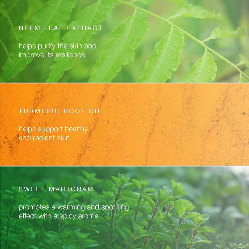 - WITH NEEM, TURMERIC & SWEET MARJORAM: Herbal ingredients with calming and soothing properties help cleanse and purify, improve resilience and keep your skin healthy and blemish free.