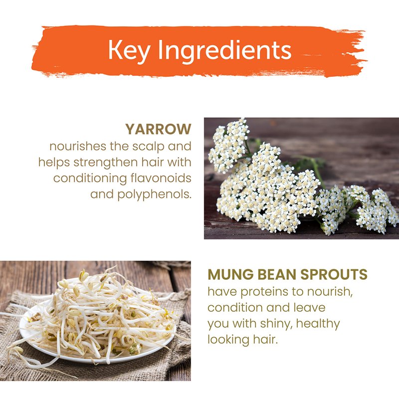 - WITH YARROW AND MUNG BEAN: With conditioning flavonoids, polyphenols and proteins that strengthen the hair and leave it looking nourished and strong.