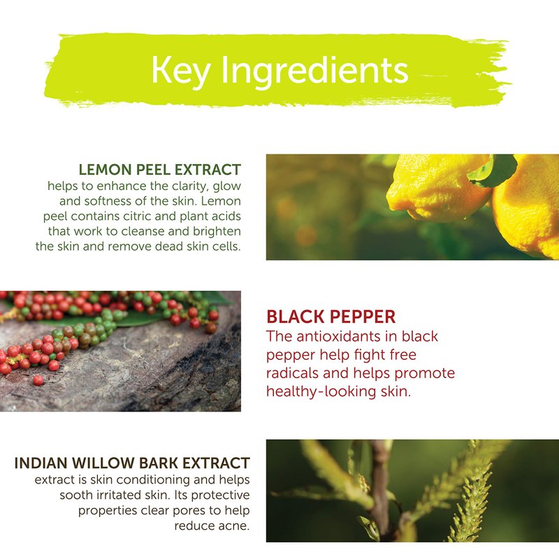 - WITH LEMON PEEL AND INDIAN WILLOW: Lemon Peel Extract is a well-known astringent that absorbs oil and awakens the skin. Indian Willow bark extract is skin conditioning and helps sooth irritated skin. Its protective properties clear pores to help reduce acne.