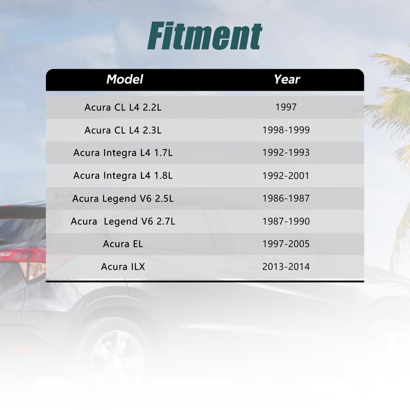- 【Fitment】Compatible with Acura: Acura CL L4 2.2L 1997; Acura CL L4 2.3L 1998-1999; Acura Integra L4 1.7L 1992-1993; Acura Integra L4 1.8L 1992-2001; Acura Legend V6 2.5L 1986-1987; Acura Legend V6 2.7L 1987-1990; Acura EL 1997-2005; Acura ILX 2013-2014.