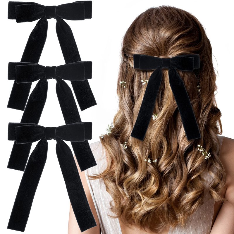 HINZIC 3Pcs Velvet Hair Bow Clips Black Hair Bows Hair Ribbons Barrettes Hair Styling Accessories for Women Girls Teens Thin Hair