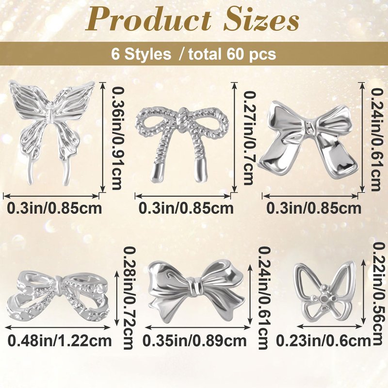 - Package Included: You will get 60 pieces of silver bow nail charm with 6 styles, each style has 10pcs. Vivid shapes and elegant silver are very suitable for nail and craft decorations. Everyone will be pleasantly surprised by their effect!