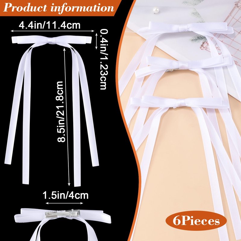 HINZIC 6PCS 4.4inch White Hair Bows Long Ribbon Satin Bow Hair Clips Barrettes Wedding Prom Engagement Halloween Decorative Hair Accessories for Teen Girl Women Bride Thin Hair