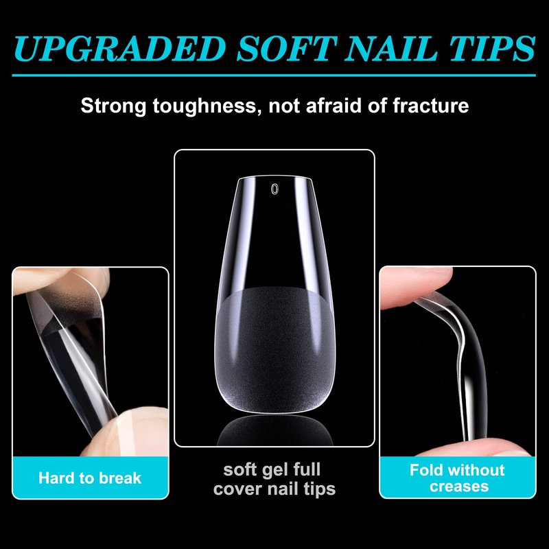 - [RELIABLE QUALITY] - Our press-on nail tips are made with newest soak-off soft gel material for long-lasting performance, lightweight, durable and not easy to bend. Make your nails look natural and nice. Last up to 4 weeks with proper application. Great both nail art for beginners and pros for home and salon. no toxins, no smell and no harm to your nails and health.