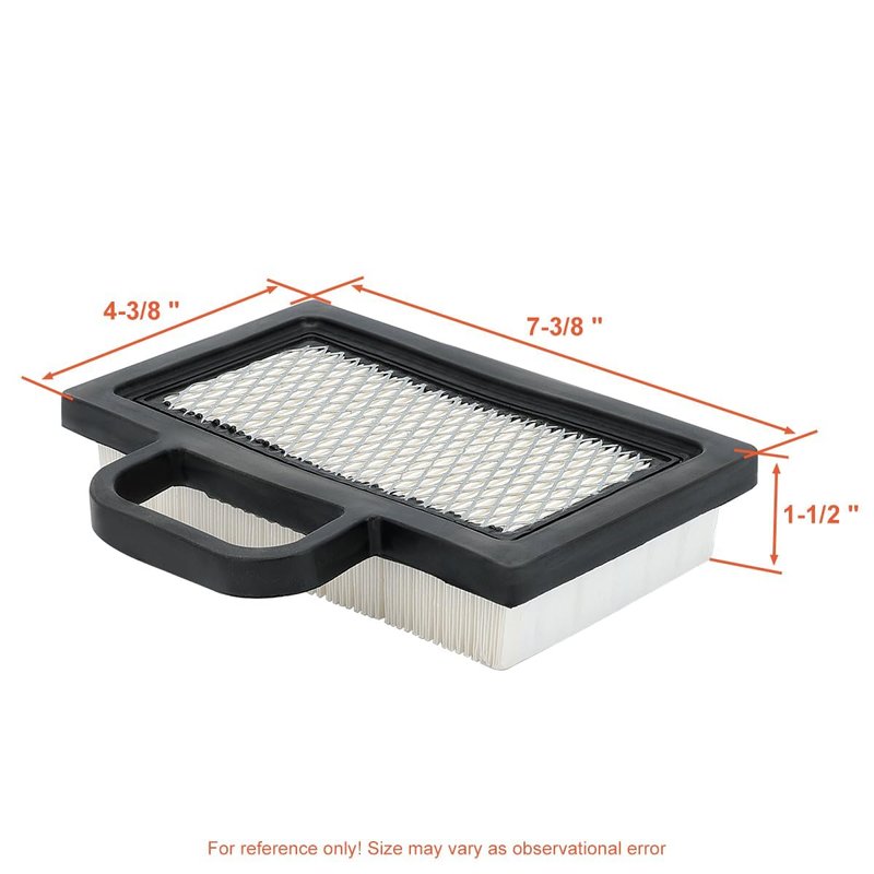 - Flat rectangular Air Filter Width: 4-3/8-inch, Length: 7-3/8-inch, Height: 1-1/2-inch ; Save yourself the hassle of returns and exchanges by double-checking your engine's model number and part number before ordering any parts