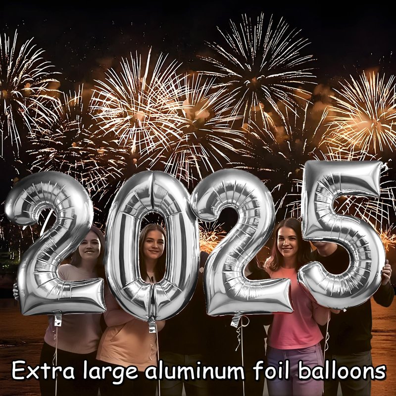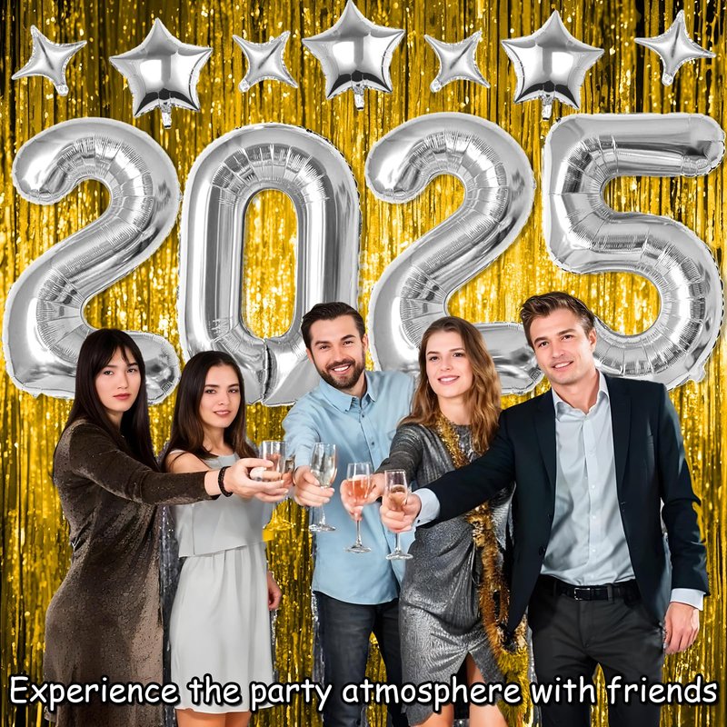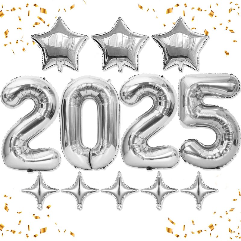 - 🎉【2025 Silver Balloons Design】Our Silver 2025 foli balloons includes 40inch Number 2025 Balloons, 2pcs 18" pentagram Silver balloons, 2pcs 10" four-pointed star Silver balloons,2pcs Inflatable Straws, 20pcs glue dots, 32ft Ribbon. They are perfect for creating a memorable New Year's Eve celebration. The Silver foil finish adds a touch of elegance that will surely impress your guests.