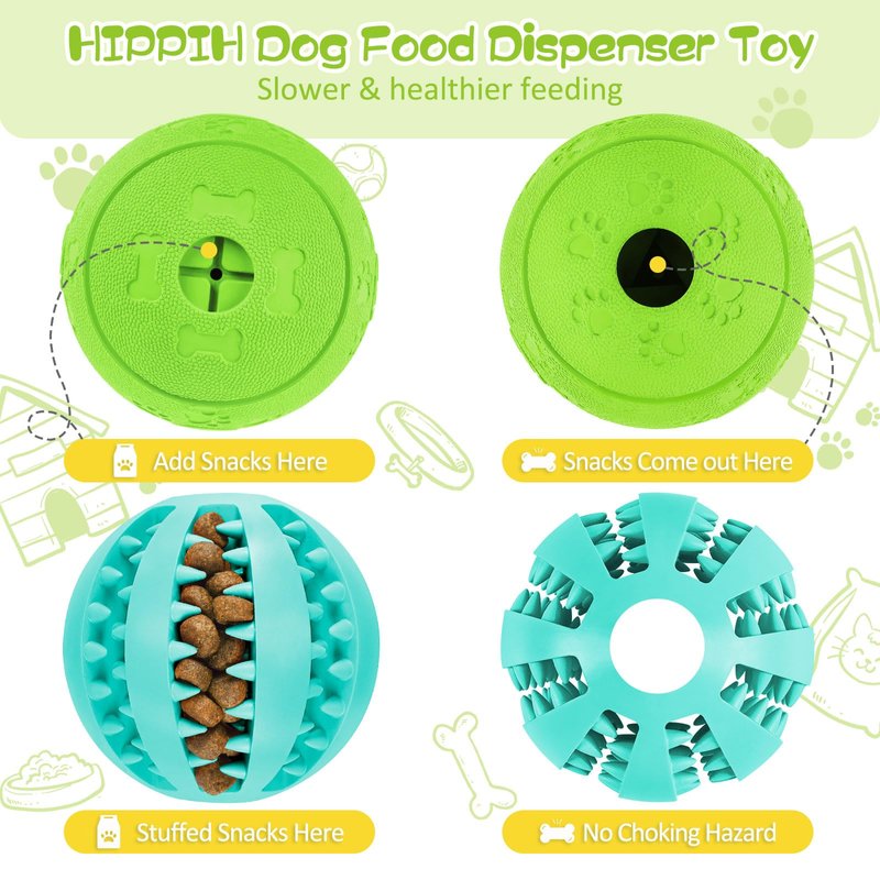 - 🐶RUBBER MATERIAL: HIPPIH treat dispensing dog ball is made of extra-tough rubber with good elasticity, good for your sweet dog grinding and fresh their teeth. ( Blue color-2.75 in, Green color-3.14 in, suitable for small and medium large dogs.)