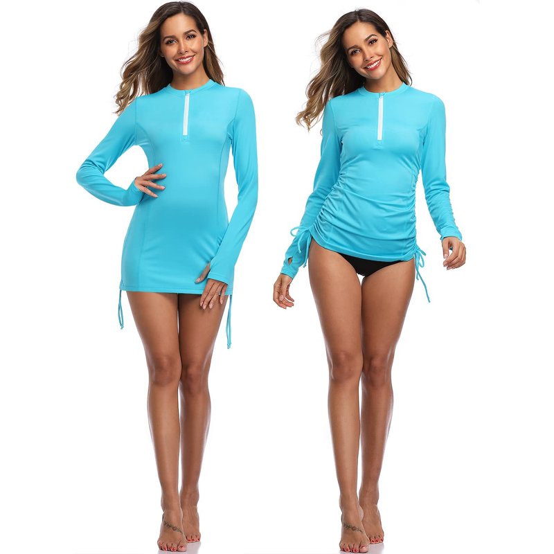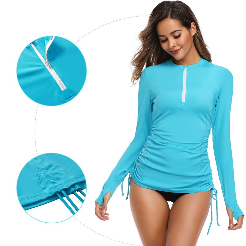 - ★Feature-The UPF 50+ sun protection layer will block out the UV radiation and protect your skin whether you are in or out of the water.Long sleeve design gives you more skin protection and protects you from sunburn.The thumb hole and drawstring design to allow a better fit and outline the perfect feminine curve and add feminine charm.