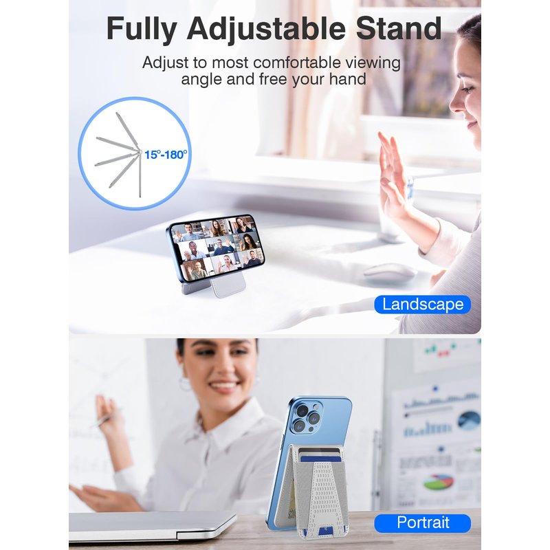- 【Adjustable Phone Stand】Hiwe for magsafe wallet stand can be adjusted to any angle between 15°and 180°, which allow you to watching your favorite shows at the comfortable viewing angle. You can rotate it to portrait or landscape mode to watching videos, facetime, or browsing the web.