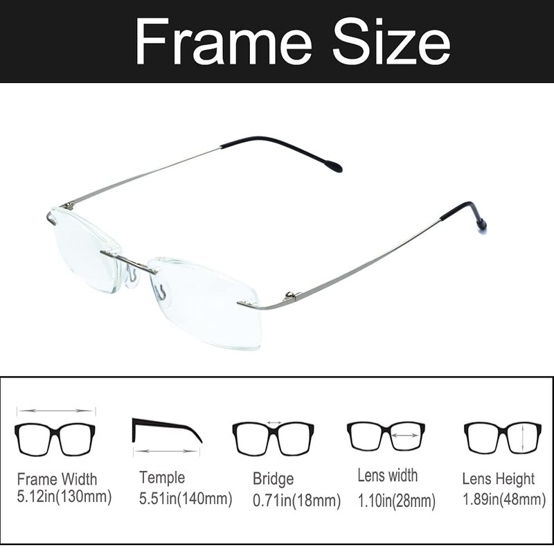- High-quality non-prescription frameless metal reading glasses, suitable for men and women, a variety of sizes are available, including: 1.00, 1.25, 1.50, 1.75, 2.00, 2.25, 2.50,2.75, 3.00, 3.50