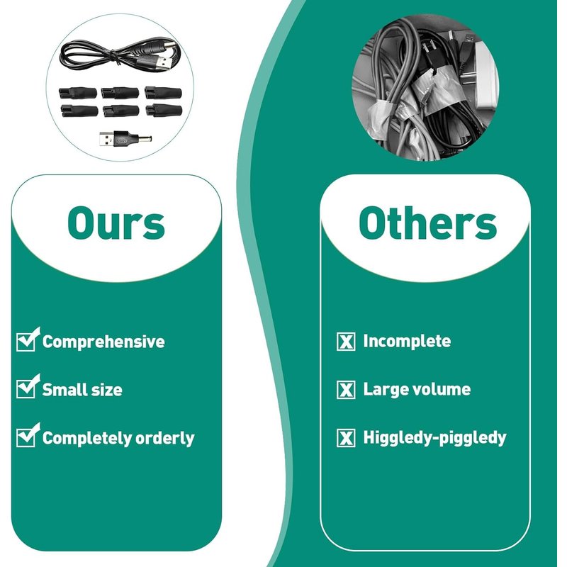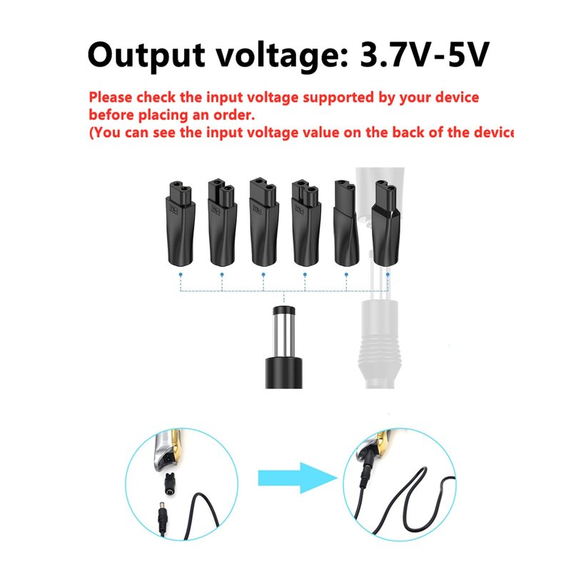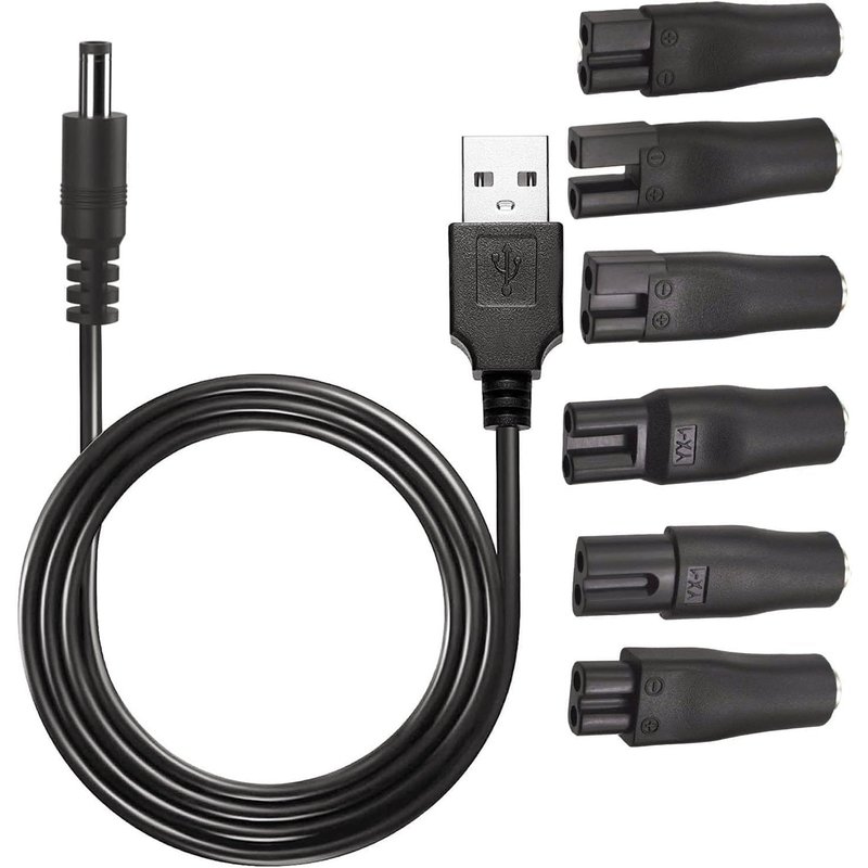 - 【6 Universal Adapter Plugs】This product contains 1 USB cable + 6 Universal Adapter Plugs, 6 Universal Adapter Plugs are compatible with 99% of electric Hair Clippers, electric Shavers, electric Dog Clippers, electrical Hairdressers, electric hair removal Razor in the market. You only need to buy a charger to charge all the same type of products you have, which is a very convenient product ! ! !