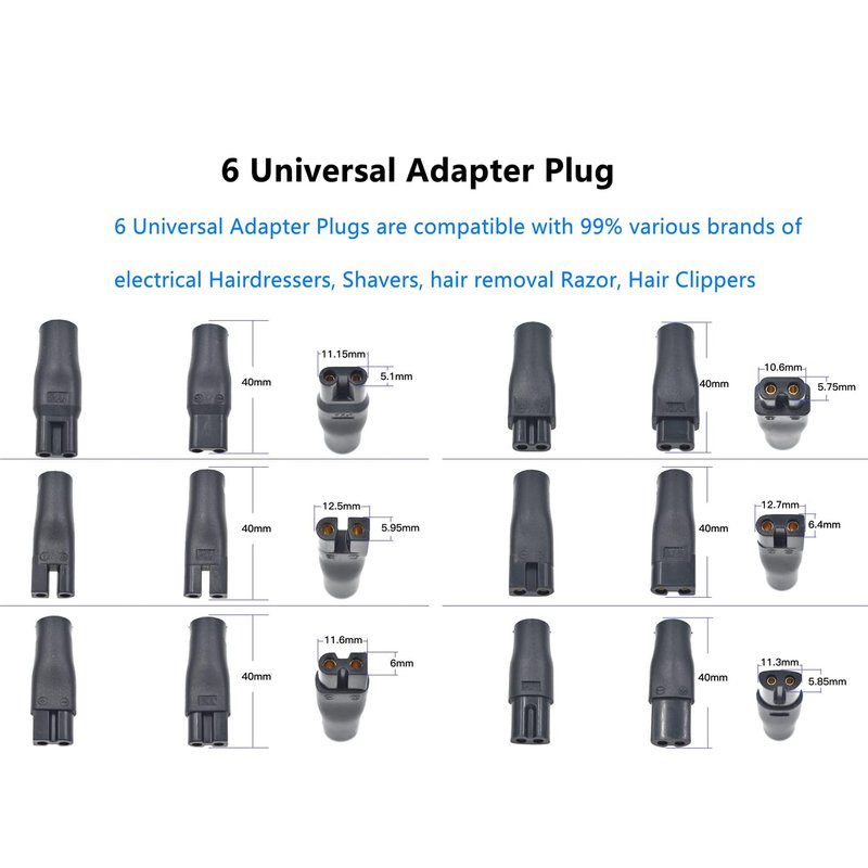 1.Wide compatibility, 6 Universal Adapter Plugs are compatible with 99% of electric Hair Clippers, electric Shavers, electric Dog Clippers, electrical Hairdressers, electric hair removal Razor in the market.