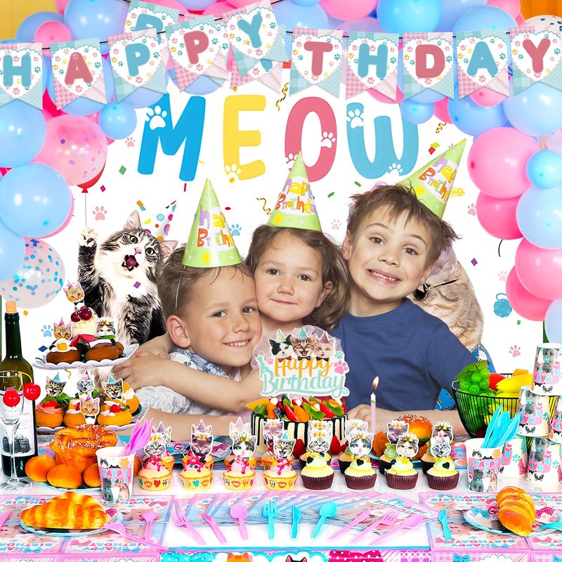 - 【High Quality Material】The cat backdrop is made of quality polyester, very smooth and flat, waterproof and colorfast, and easy to clean, all paper products are made of heavy-duty paper, and are all printed with food-grade water-based ink which is suitable for food contact. Cat-themed table cover is spill-proofed and stain-resistant, making it easy to clean up after the party. Balloons are made of natural latex, harmless and non-toxic, and safe to play around children
