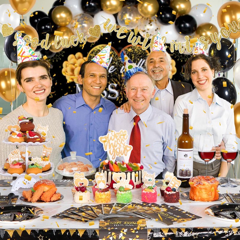 - 【Unique Design】The we will miss you decorations set features an black and gold design. When someone leaves, it’s important to let them know they will be missed. It contains rich going away party decorations elements, they can fit well with your other farewell party decorations. Show how much you care for coworker, boss, teacher, nurse, supervisor, friend, or family member who are leaving or starting a new trip in their life