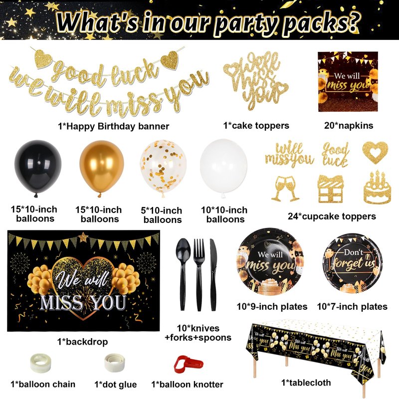 - 【A Complete Going Away Party Decorations】You will get total 146 pcs we will miss you decorations in a bag which includes 45 x we will miss you balloons, 1x we will miss you banner, 1 x going away party decorations backdrop and tablecloth, 24 x goodbye party decorations cupcake topper, 1 x farewell decorations cake topper, 10 x 7-inch plates, 10 x 9-inch plates, 10 x knives, 10 x forks, 10 x spoons, 20 x napkins, 1 x balloon ribbon, 1 x glue dot, 1 x balloon strip