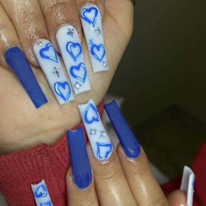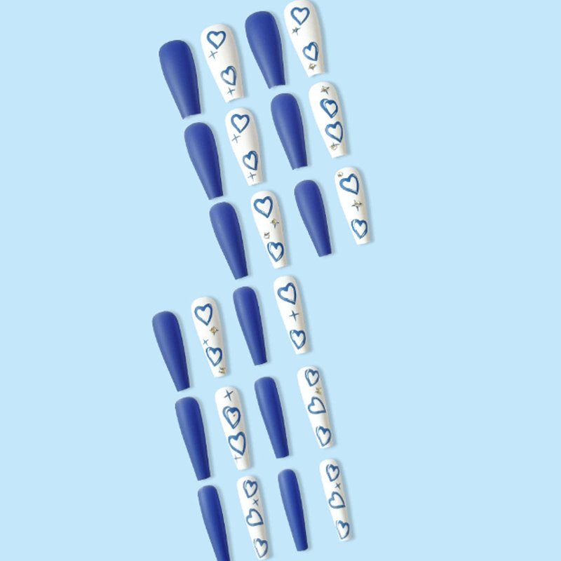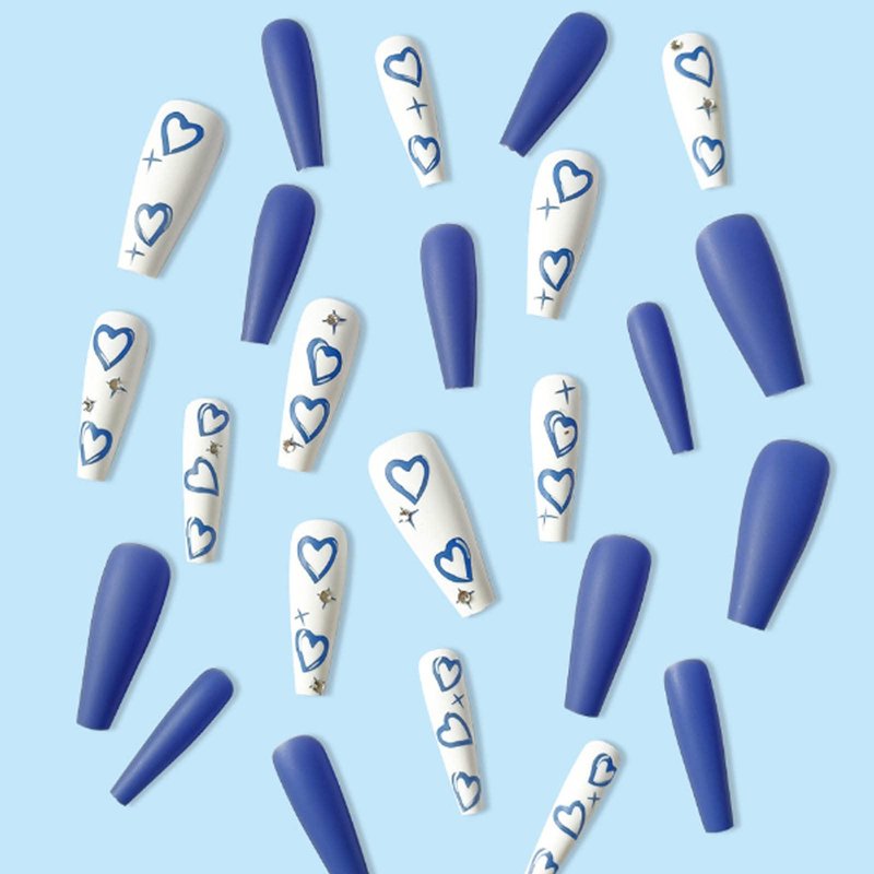 Hkanlre Blue Press on Nails Tips Coffin Long Heart Fake Nails Bling Full Cover Ballerina Graffiti False Nails for Women and Girls 24PCS