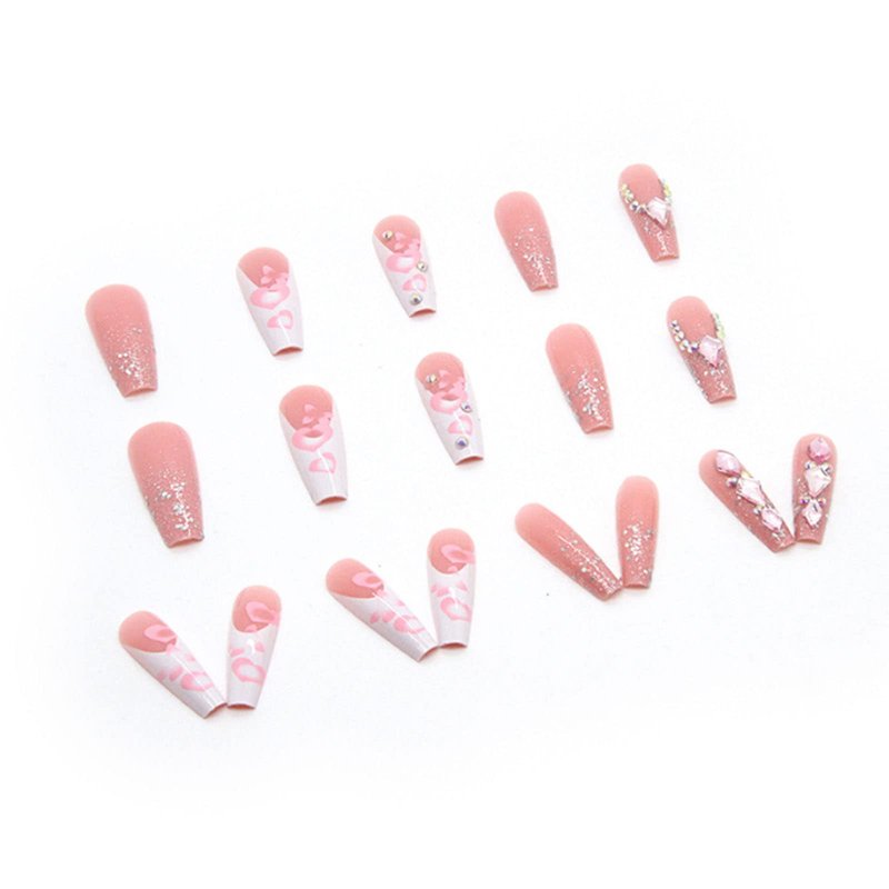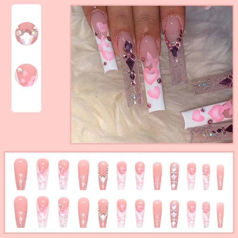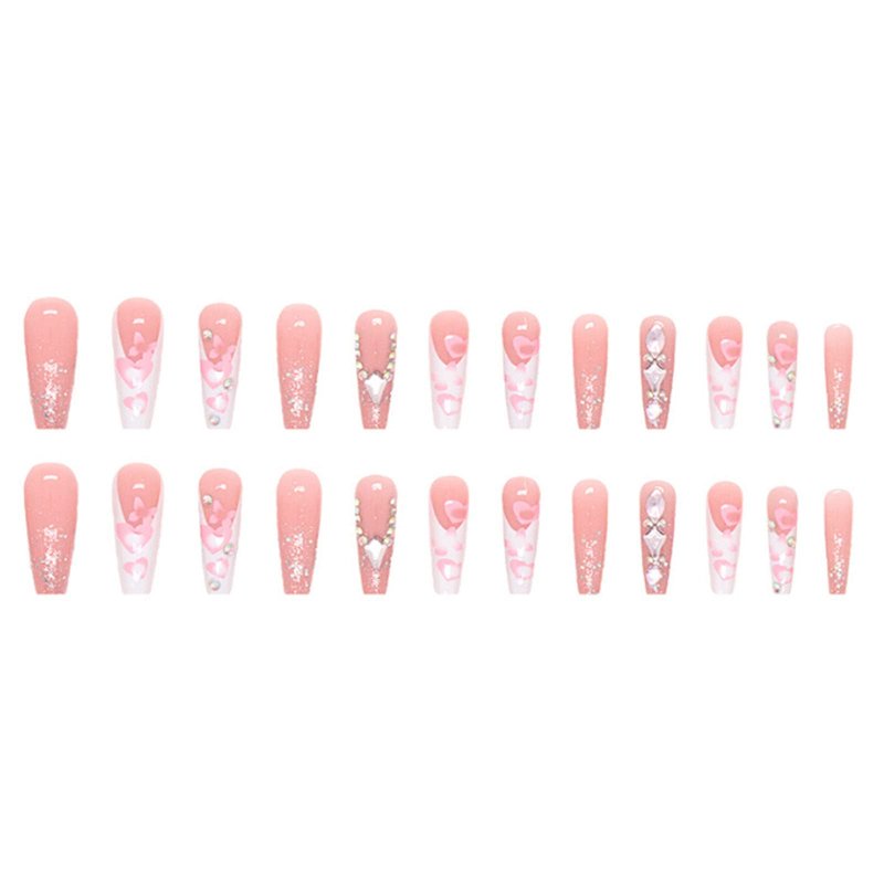 Hkanlre Coffn Press on Nails Tips Ballerina Long Heart Fake Pink Nails Full Cover Rhinestones Coffin False Nails for Women and Girls 24PCS