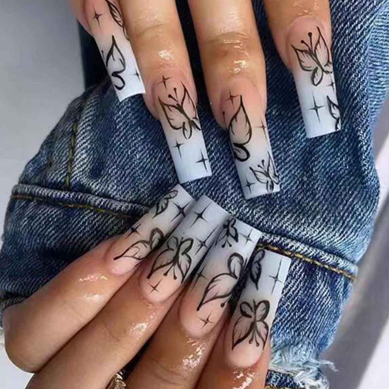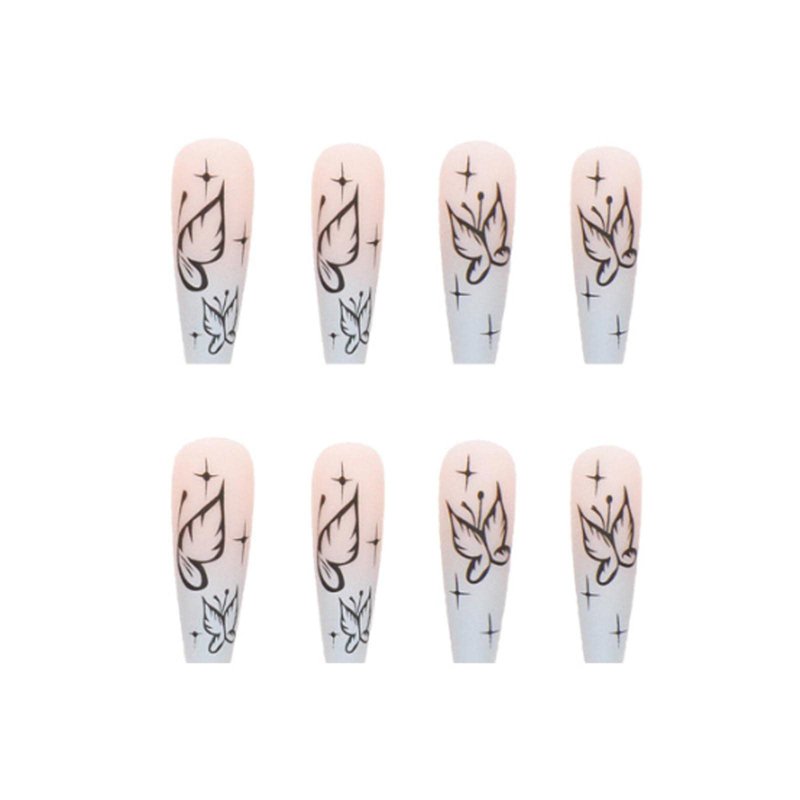 - Long coffin ballerina press on fake nails with design can make you get unique, beautiful, and fun manicures in minutes instead of waiting in line at nail salons. The package includes: one rubbing strip, 36 jelly gels