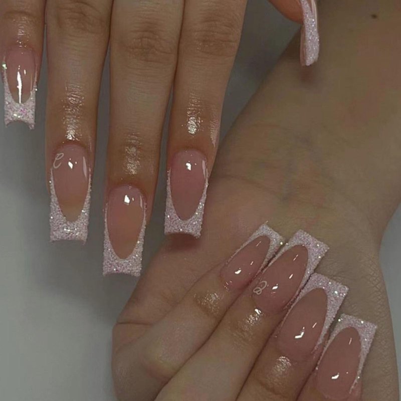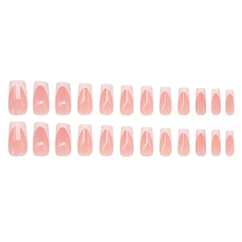 Hkanlre Shiny Square Press on Nails Shiny Fake Nails French Tips Full Cover Medium Pink False Nails for Women and Girls 24PCS