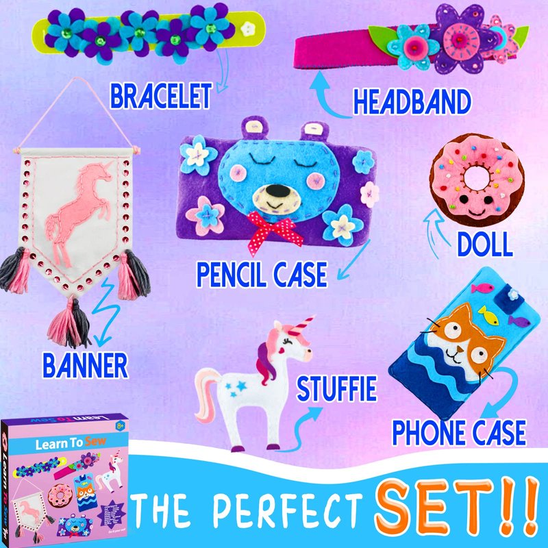 - π[What Contained in the First Sewing Kit] Our DIY craft kits include 7pcs cute sewing projects: unicorn, pencil case, bracelet, headband, banner, donut and phone case. The educational felt kit with all sewing supplies in a beautiful box would be a perfect gift for your kids.