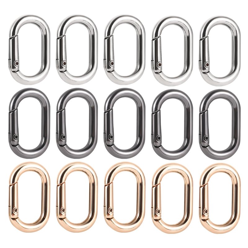 HLTOO 15PCS Spring Claps Connector, Metal Spring Jewelry Clasps, Spring Snap Hooks Clip Buckle, for Bags, Purses, Keychains, 3 ColorsPackage Included: You will receive 15PCS Spring Claps Connector in 3 Colors, such as Gold, Silver and Black, each color 5PCS, enough quantity and color choices for your DIY Purse Making and other crafts.Material: The Spring Jewelry Clasps are made of high quality alloy, very sturdy and durable, not easy to rust or deform, can be used for a long time. The surface is very smooth, nickel and lead free, which will not hurt your hands when using.Size: The inner diameter is 22mm/0.87inch, The width is 20mm/0.79inch; The thickness is 4.3mm/0.17inch.Easy to Use: The Metal Rings are designed with built-in spring, very convenient to open or close, so you can connect them to any items you want.Wide Applications: The Spring Claps Connector are perfect accessories for hammock, wind chime, macrame ornaments, sewing projects, plant hanger, tissue ring, webbing, strapping, leather, ribbon, dog collar and any other DIY Crafts; Also, they can be deocorations for handbag, shoulder strap, harnesses and clothes, luggage belts, backpack, etc.After Sales Service: If the Spring Claps Connector you received are damaged or missed quantity, please contact us for replacement or refund.