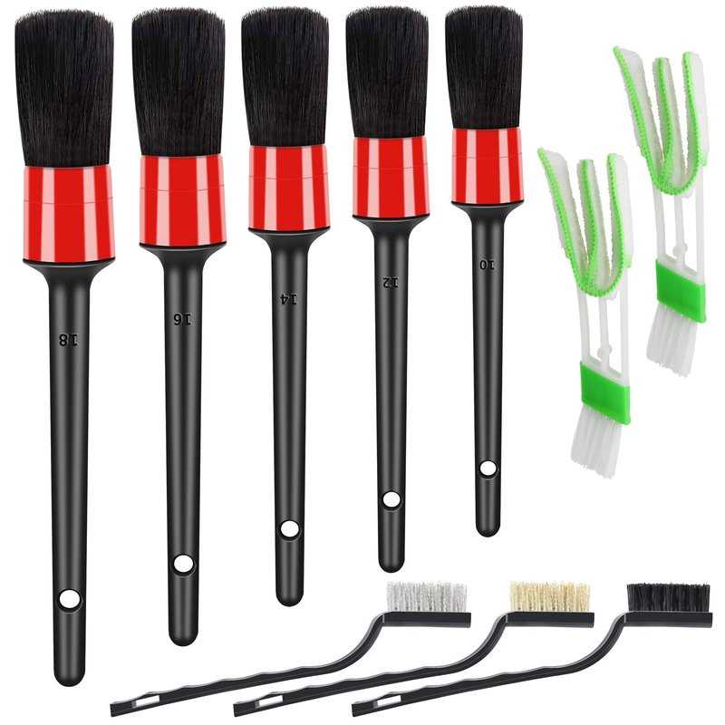 - VARIOUS SIZE : 5 different size auto detailing brushes are satisfy with any cleaning needs. The smaller detailing brush can get into all the little cracks, the nooks, the lug nuts or tight space. The lager detailing brush suit for cleaning exterior and wider area more efficiently. Such as wheels, air vent, car seats, engine bay, dashboard,emblems and so on.