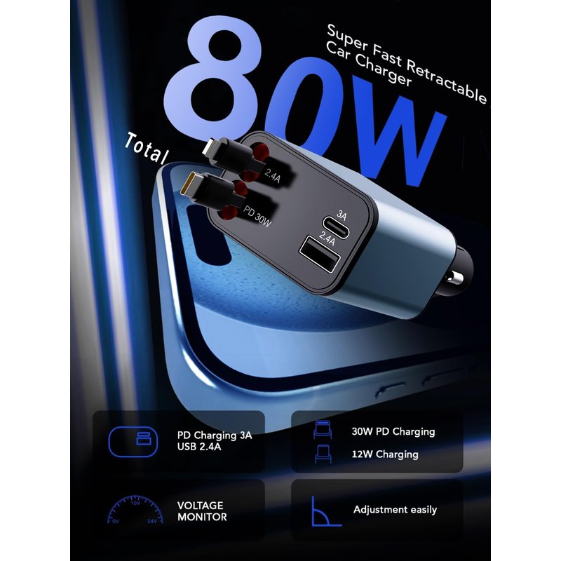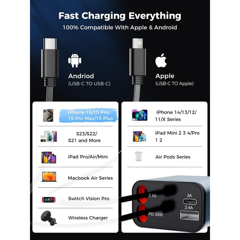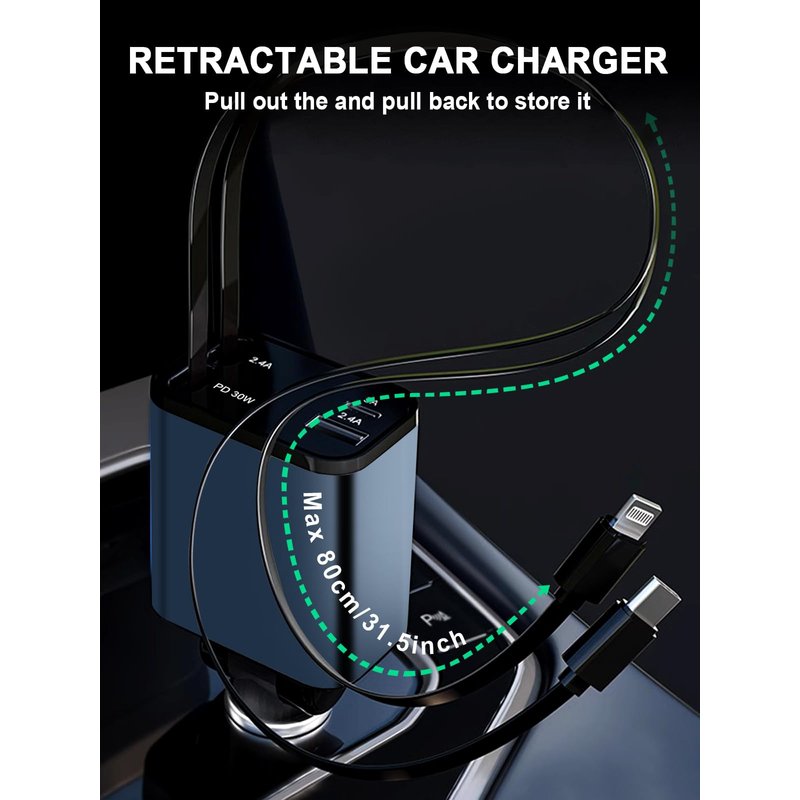 - PD 30W Fast Charger: Retractable car charger that dvices are fast charging,built in fuse,overcurrent and short circuit protection, and short circuit protection to protect your device's battery from over charge damage. compatible with iPhone car charger / Car charger USB-C,car organization facilitating convenient control and usage
