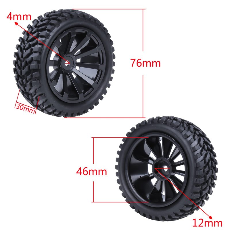 - Not Pre-glued. Check size. Tire Outer Diameter Approx 2.99''(76mm),Width: Approx 1.18'' (30mm), Wheel Inner Diameter: 1.81" (46mm), Drive Hubs:12mm Hex, Diameter of the Axle Hole :4mm.
