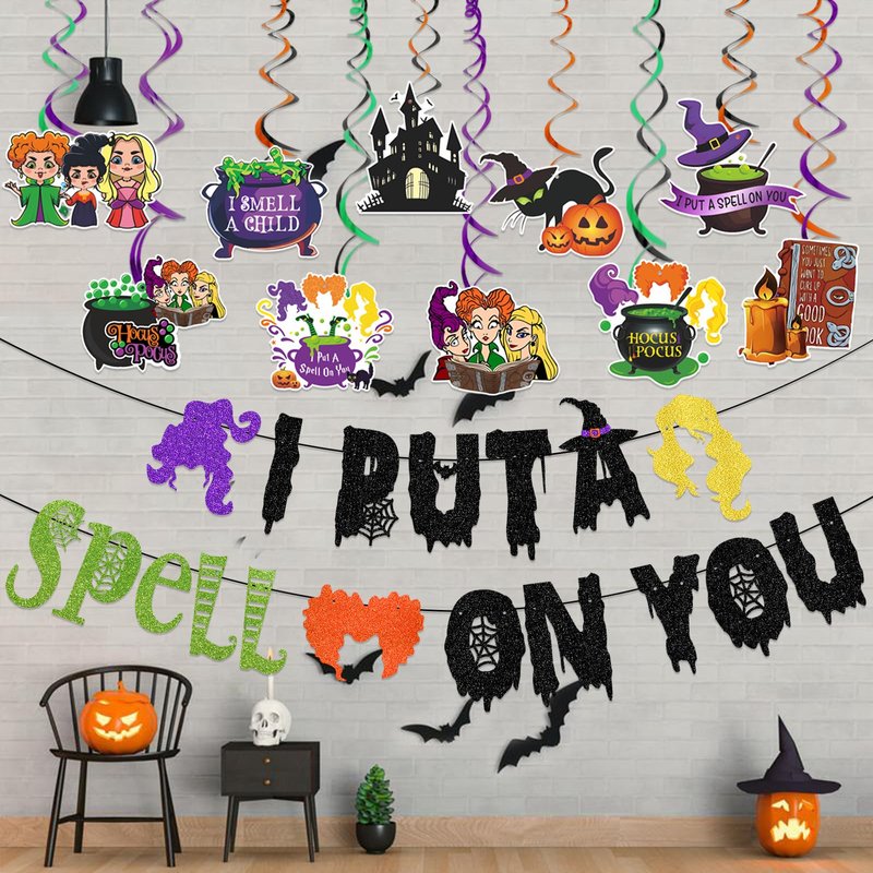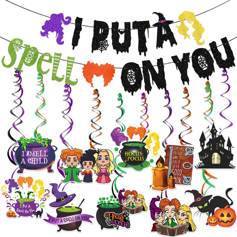 - Elevate your Halloween decorations with our "I Put a Spell on You" banner and 6pcs Hocus Pocus Party Hanging Swirl set. From the enchanting banner to the swirling hangings, this combination will create an immersive and unforgettable Halloween experience.