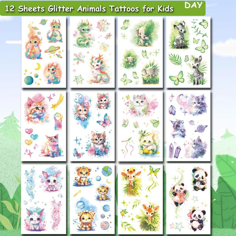- 🎁【Glitter Animals Themed Tattoos for Kids】Colorful glitter animals tattoos for kids, Use them as party favors and your kids will love. Perfect for animals themed party, birthday activities, family gathering and other party events. They will be you and kids' favorite small gifts.