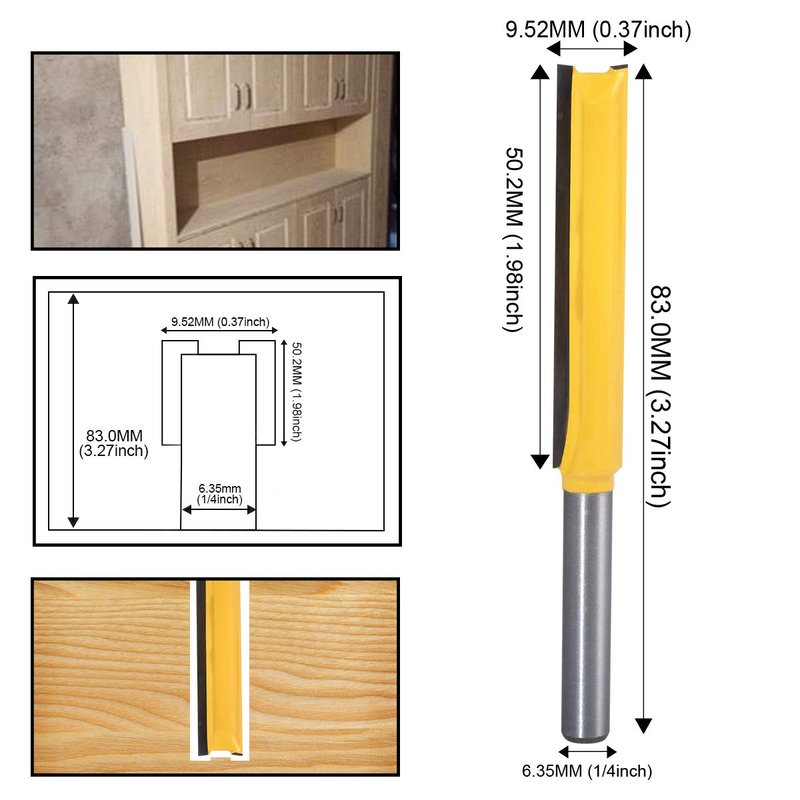 - [Size of the straight router bit] The router bits Shank: 1/4 inch, Cutting Diameter: 3/8 inch, Cut Length/Cutting Height: 2 inch