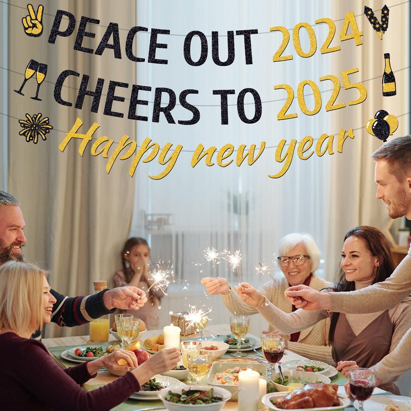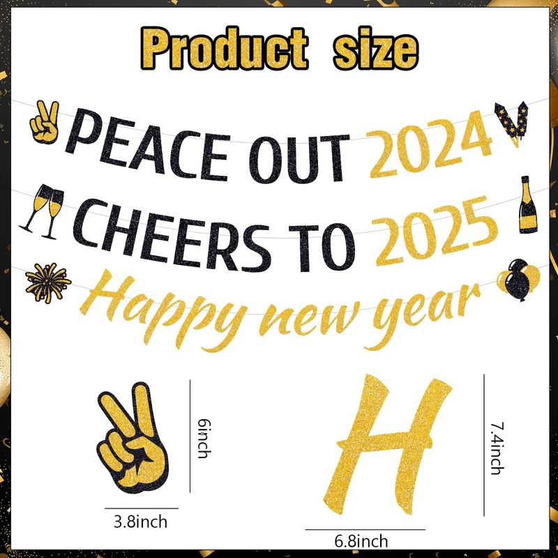 - New Year Theme Design: The golden and shiny "Peace out 2024 Cheers to 2025" text adds a festive and eye-catching element to your event decoration. The festive banners and tassels bring a lively and fun atmosphere, making it a perfect choice for New Year's parties. The theme uses playful designs such as balloons and wine glasses to create a festive and humorous atmosphere for your celebration.