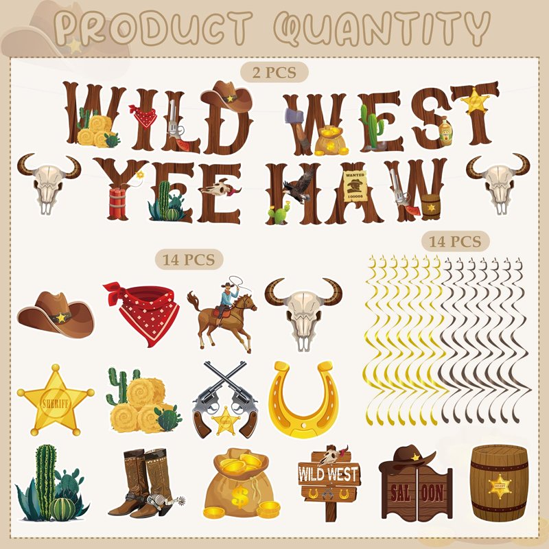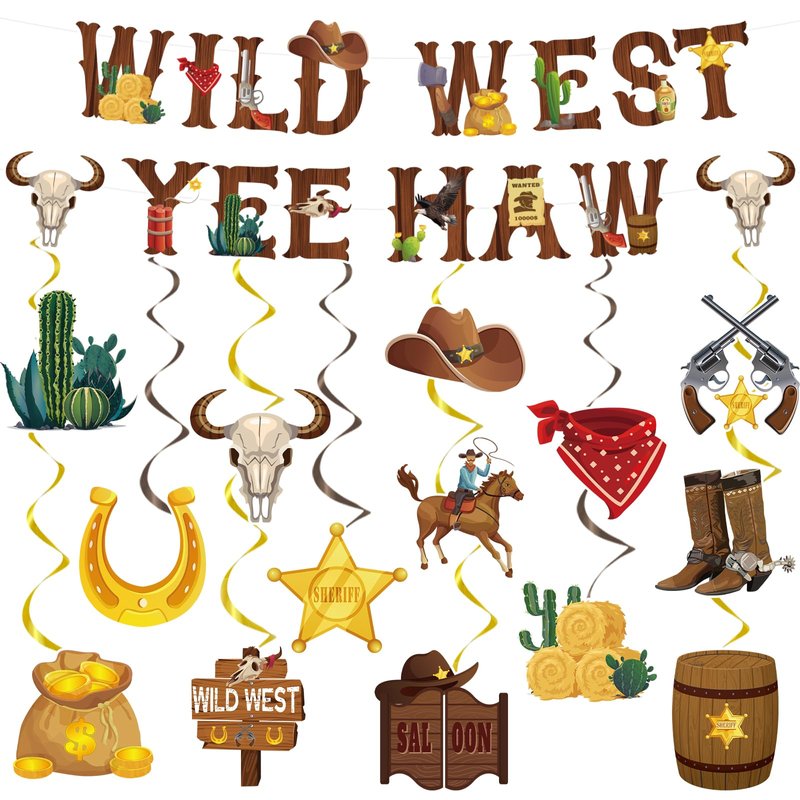 - What You Get: The package includes 2 pieces wild west yee haw banners, 16 pieces hanging swirl decorations. Bright colors and various designs add atmosphere, chic style, sufficient quantity to meet your decoration needs, create a wonderful cowboy birthday party