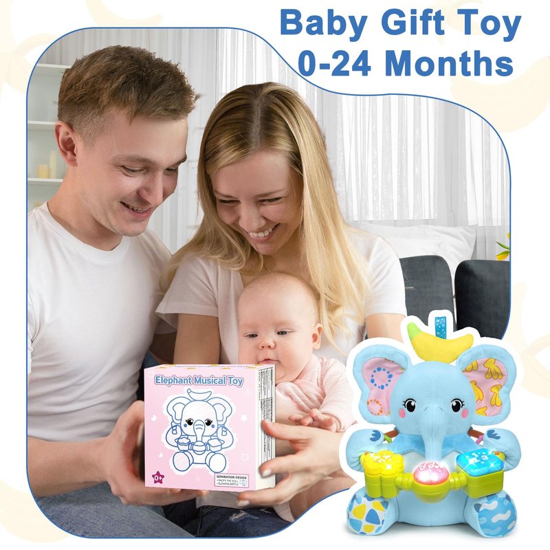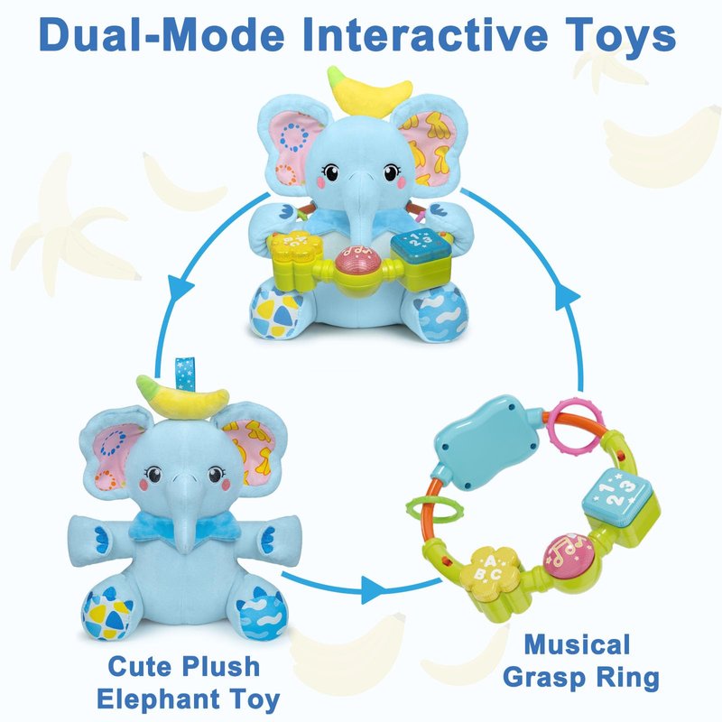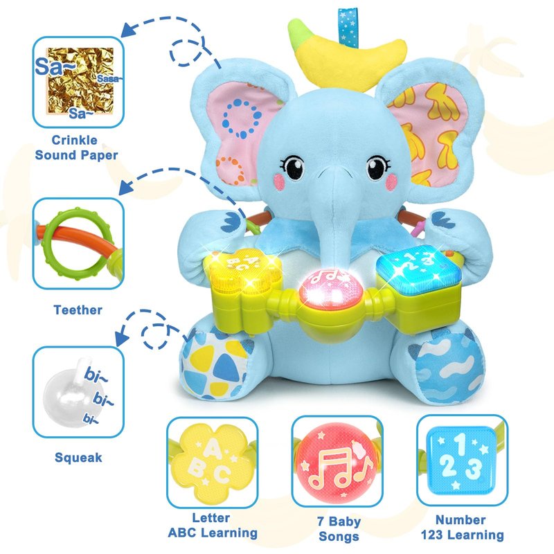 - Built for Fun:An easy-to-grasp bead ring hangs around the baby elephant toy.The bead ring has 3 buttons, Pressing these buttons activates flashing LED lights and learning of numbers 123,letters ABC, and playing 7 musical tracks. Additionally, there are 2 teethers located behind the grab ring, providing a variety of engaging experiences for baby toy 0-6-12 months.