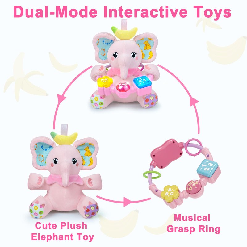 - Built for Fun:An easy-to-grasp bead ring hangs around the baby elephant toy.The bead ring has 3 buttons, Pressing these buttons activates flashing LED lights and learning of numbers 123,letters ABC, and playing 7 musical tracks. Additionally, there are 2 teethers located behind the grab ring, providing a variety of engaging experiences for baby toy 0-6-12 months.