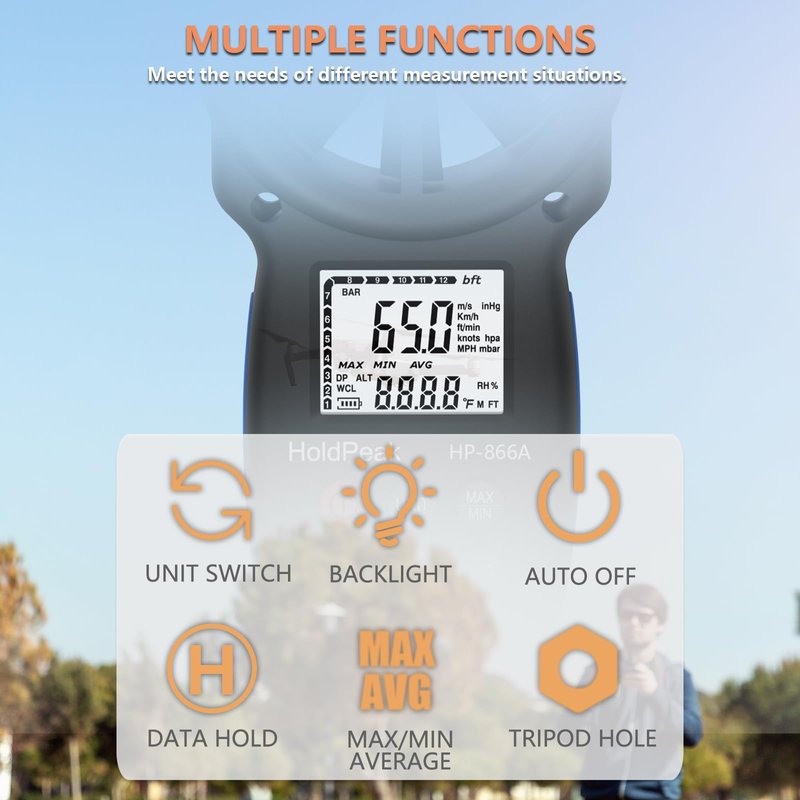 This HOLDPEAK 866A-black Digital Anemometer is ideal for outdoor activities such as Windsurfing; Flying Kite, Aeromodelling and UAV, Sailing, Surfing, Fishing, Hiking, Shooting, Walking etc.