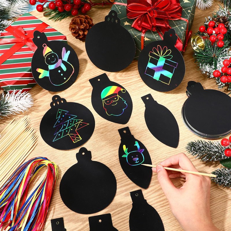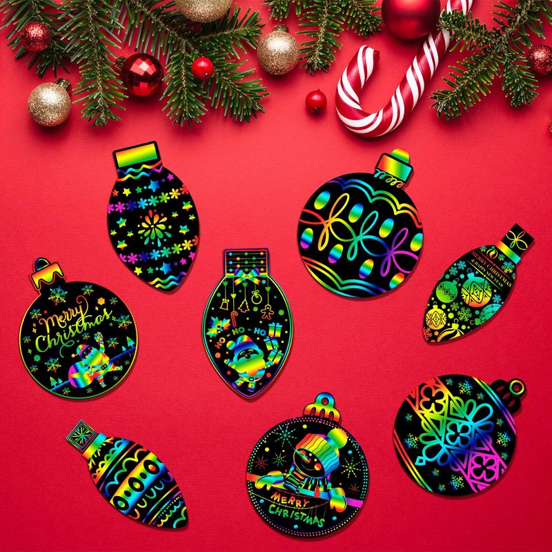 - Create Christmas Atmosphere: unwrap your creativity through our rainbow color scratch cards; Just use the included sticks to etch patterns on the black coating; Once done, you can hang them on your wall as festive decorations or dangle them on your tree