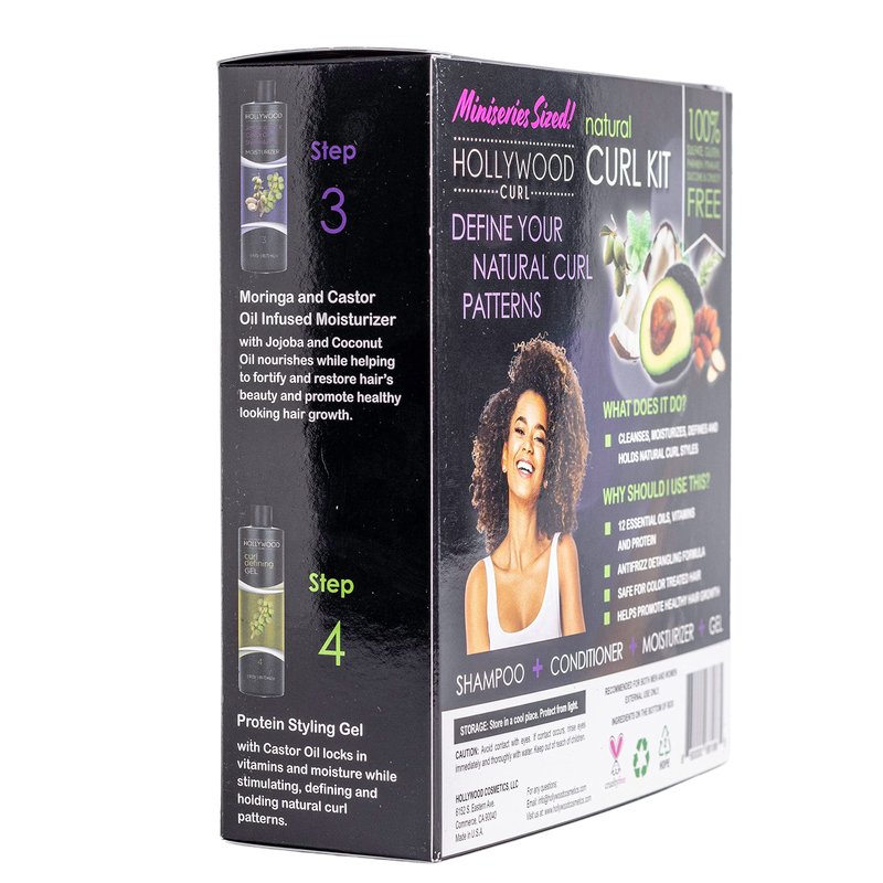 Hollywood Curl 4 Pack Natural Curl Styling Kit - Women and Men – Wavy and Frizzy Hair Control - w/Essential Oils, Vitamins, and Protein – Includes Shampoo, Conditioner, Curling Cream, and Styling Gel