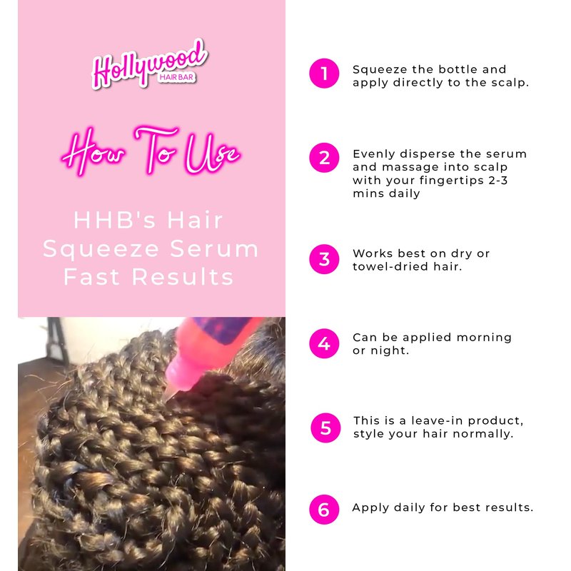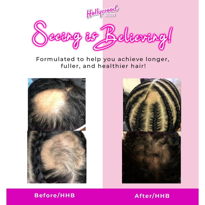 Hollywood Hair Bar's Hair Regrowth Serum Squeeze was created for people with catastrophic hair loss who were told their hair would never grow back and to give up trying. Our Hair Regrowth Serum is made from amazing all natural essential oils, herbs and fruit oils that penetrate the scalp, grow back your edges, fill in your bald spots and grow your hair super fast.