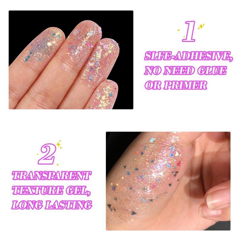 - Long Lasting Waterproof : The body glitter gel color is very vibrant and high quality formula is good waterproof. Dry and not easily transferred and can long last for a whole day. It has a good glow and nice texture, lightweight, super-sparkly glitter gel that dries clear. The glitter looks great and you sparkle as long as you want to.