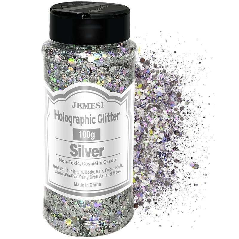 Holographic Chunky Glitter, 100g Silver Cosmetic Craft Glitter for Epoxy Resin, Nail Sequins Iridescent Flakes, Body, Face, Hair, Nail, Glitter Slime Making