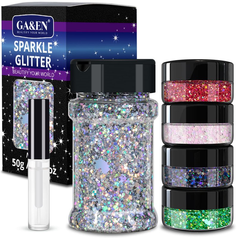 ✨PACKAGE CONTAINS: You will receive 1 jar of 50g+4jars of 8g holographic chunky glitter in different colors: 50g laser silver+8g laser black+8g pink&white+8g laser red+8g laser green(82g in total); And 1 pc of quick dry makeup glue for body makeup. ✨MULTIPLE SIZES&SHAPES: The glitter is mixed with different shapes(HEXAGON; STAR; HEART and UNICORN) in different sizes(0.2mm & 0.6mm & 1mm & 1.6mm & 2mm & 3mm & 6mm). The glitter is perfect for body & Face & Hair make up & nail arts decoration. ✨DIVERSE USE: Such great amount of holographic chunky glitter can be applied on your eyes, face, hair or every part of your body as you wish for many times! The chunky glitter is also perfect for nail art, resin, tumblers, or any handicraft and project ✨GREAT DESIGN OF CAP: Two lids are designed on the cap. If you want to makeup your body, do nail art or make your project with small amount of glitter, open the lid with 4 small holes and pour the glitter. If you are going to use a large amount of it, open another lid with a big hole. This design helps you finish your work more conveniently with controling the amount. ✨BEAUTIFUL AND UNIQUE: Makingup and making project with this sparkle chunky glitter, you will be the most special and beautiful on every occasion. DIY with the sparkle glitter, every ornament you make must be unique and gorgeous!