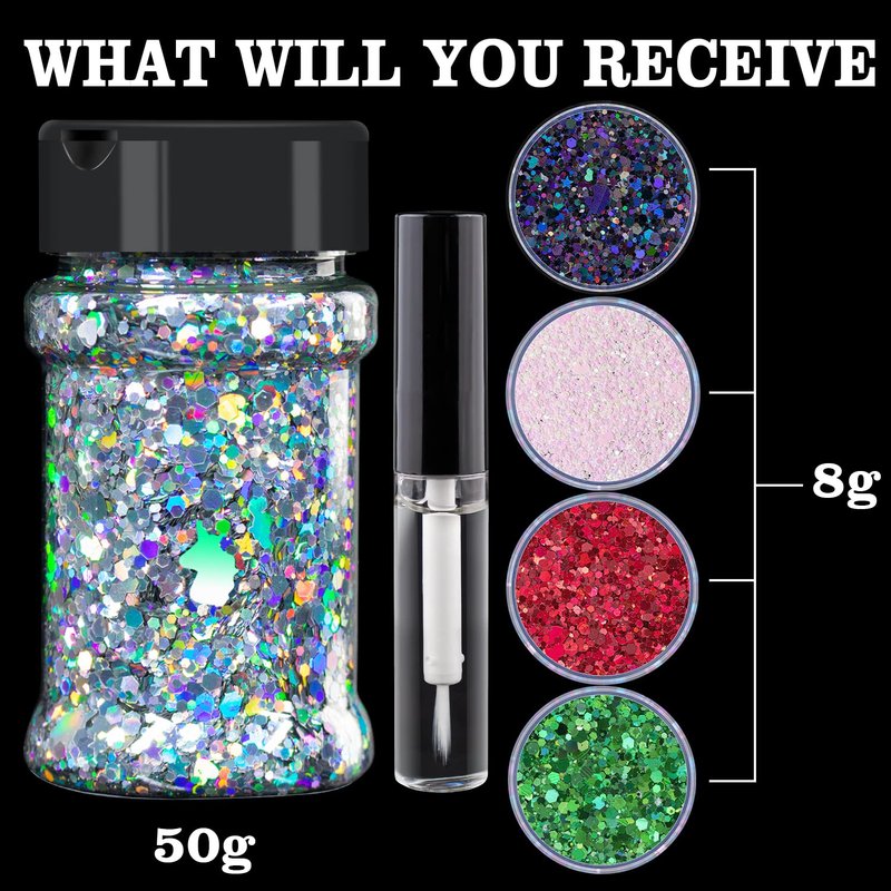 - ✨PACKAGE CONTAINS: You will receive 1 jar of 50g+4jars of 8g holographic chunky glitter in different colors: 50g laser silver+8g laser black+8g pink&white+8g laser red+8g laser green(82g in total); And 1 pc of quick dry makeup glue for body makeup.