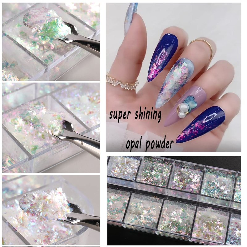 Holographic Opal Nail Art Glitter Flakes Powder Aurora Iridescent Pigment Ice Crystal Mermaid Paillettes Sparkly Sequins Design for Manicure Decoration Accessories 12 Grids