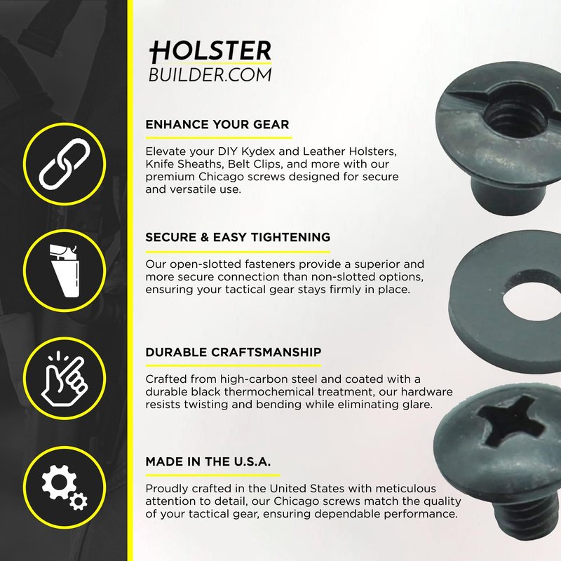 Elevate your tactical gear with Holsterbuilder's Premium Chicago Screws, the ideal choice for DIY Kydex and Leather Holsters, Knife Sheaths, Belt Clips, and more. Crafted from high-carbon steel and coated with a cutting-edge black thermochemical treatment, these open-slotted fasteners ensure a secure connection, eliminating worries about loose gear. Proudly made in the U.S.A., Holsterbuilder pays meticulous attention to detail, matching the high-quality standards of your tactical equipment. Versatile and built to last, these screws are a reliable choice to enhance the functionality and durability of your gear. Upgrade your DIY projects with Holsterbuilder's Chicago screws and experience the precision and reliability that sets our craftsmanship apart.
